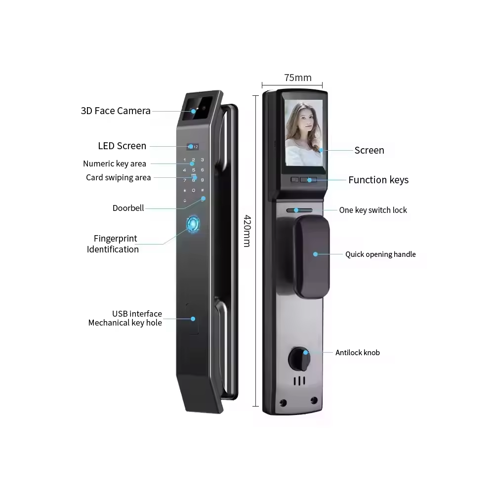 • Clearly labeled access areas for face recognition, card swiping, doorbell, and fingerprint sensor