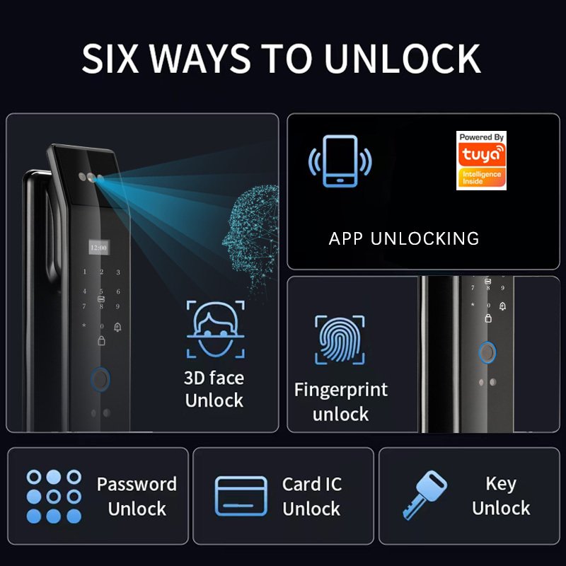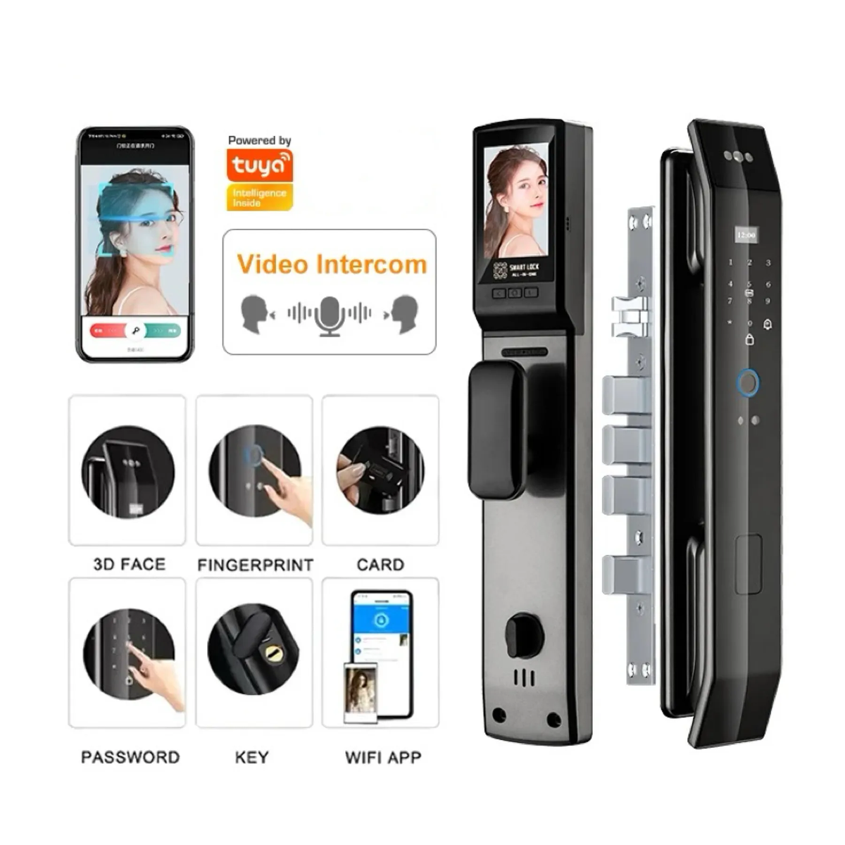 A premium Tuya WiFi smart lock with a built in visual intercom, giving you smart access plus the ability to see and respond to visitors from the lock screen or your phone.