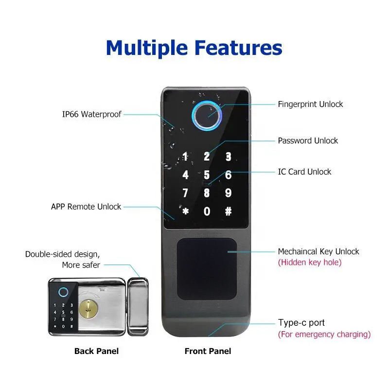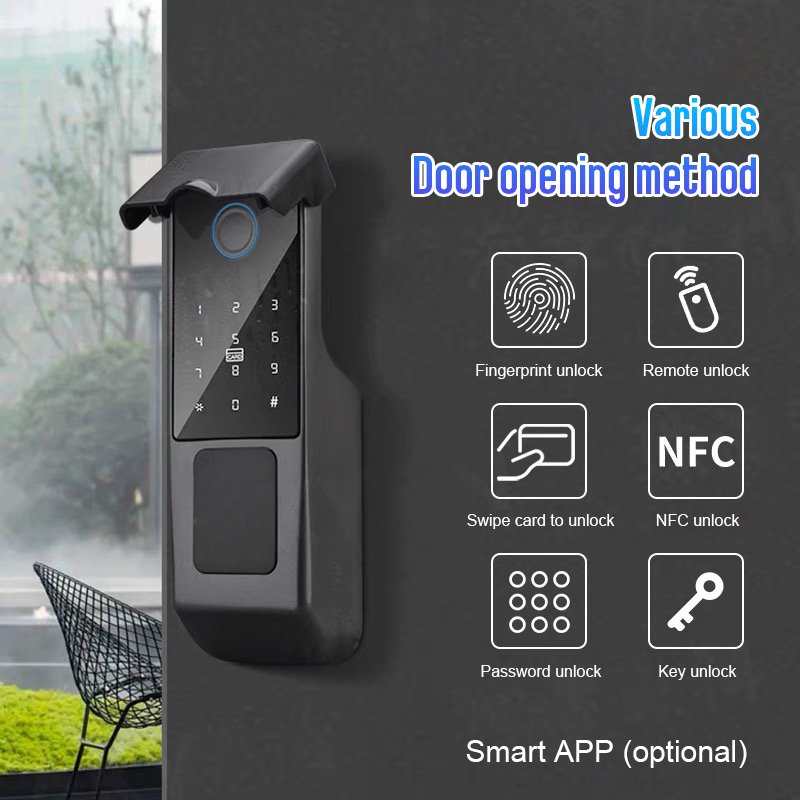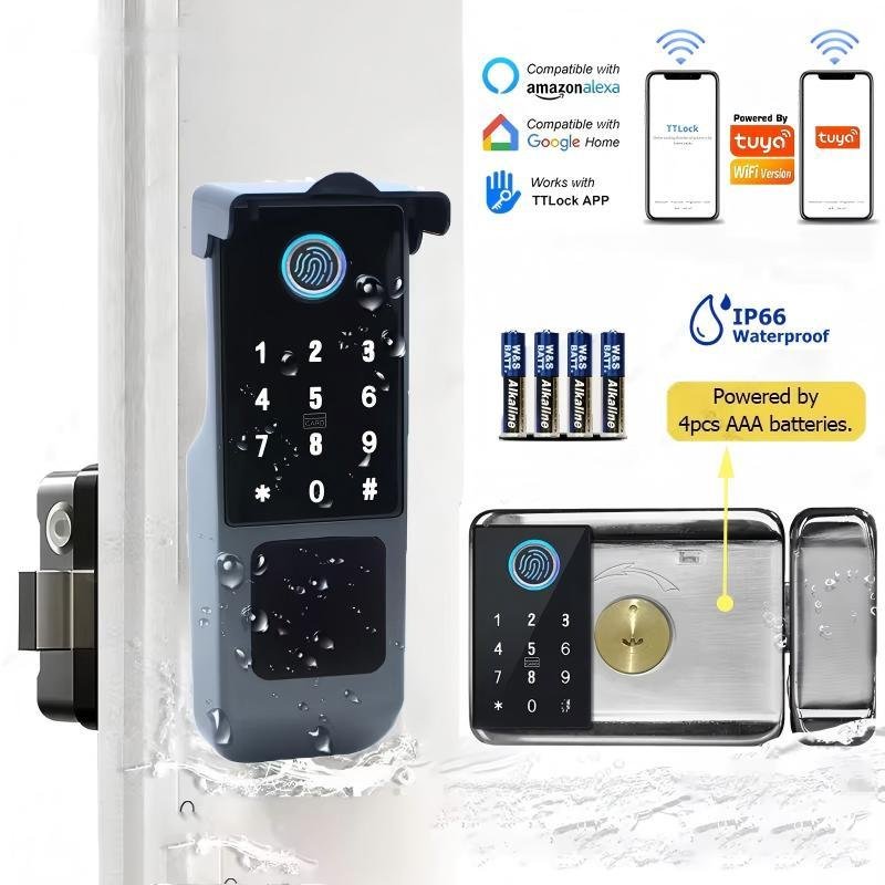 Smart J22 is a waterproof smart rim lock for gates and outdoor doors, offering 5 to 6 ways to unlock plus emergency power support and optional rain cover protection.