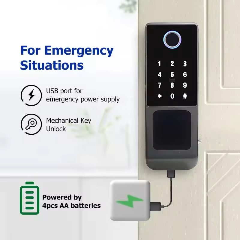 J22 is powered by 4 AA batteries for regular use, and it also supports emergency power through a Type C port. If batteries run low unexpectedly, you can power the lock temporarily to gain access.
